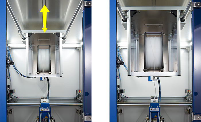 2kg までのフィラメントを設置できるフィラメントボックスを本体上部に設置。造形中のプリントヘッドの動きに合わせてフィラメントボックスは前後に稼働するので、フィラメントローディング中の抵抗を減らしスムーズな送り出しを可能にします。