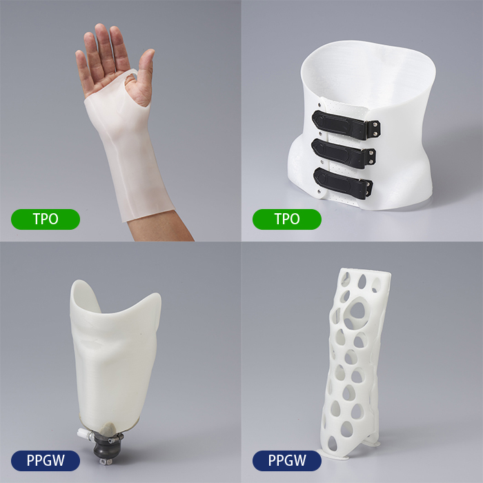 TPO はオレフィン系エラストマー樹脂。肌に優しくしなやかさが特徴。層間強度が高くはがれにくいので体幹装具の造形に適します。汚れても簡単に拭き取れるので清潔性を保ちやすく、PLA や ABS より吸湿性も低く扱い易い素材です。PPGW はグラスウール配合のポリプロピレン樹脂。軽量高強度で耐衝撃性と靭性に優れており、短下肢装具やチェックソケットの造形に向いています。